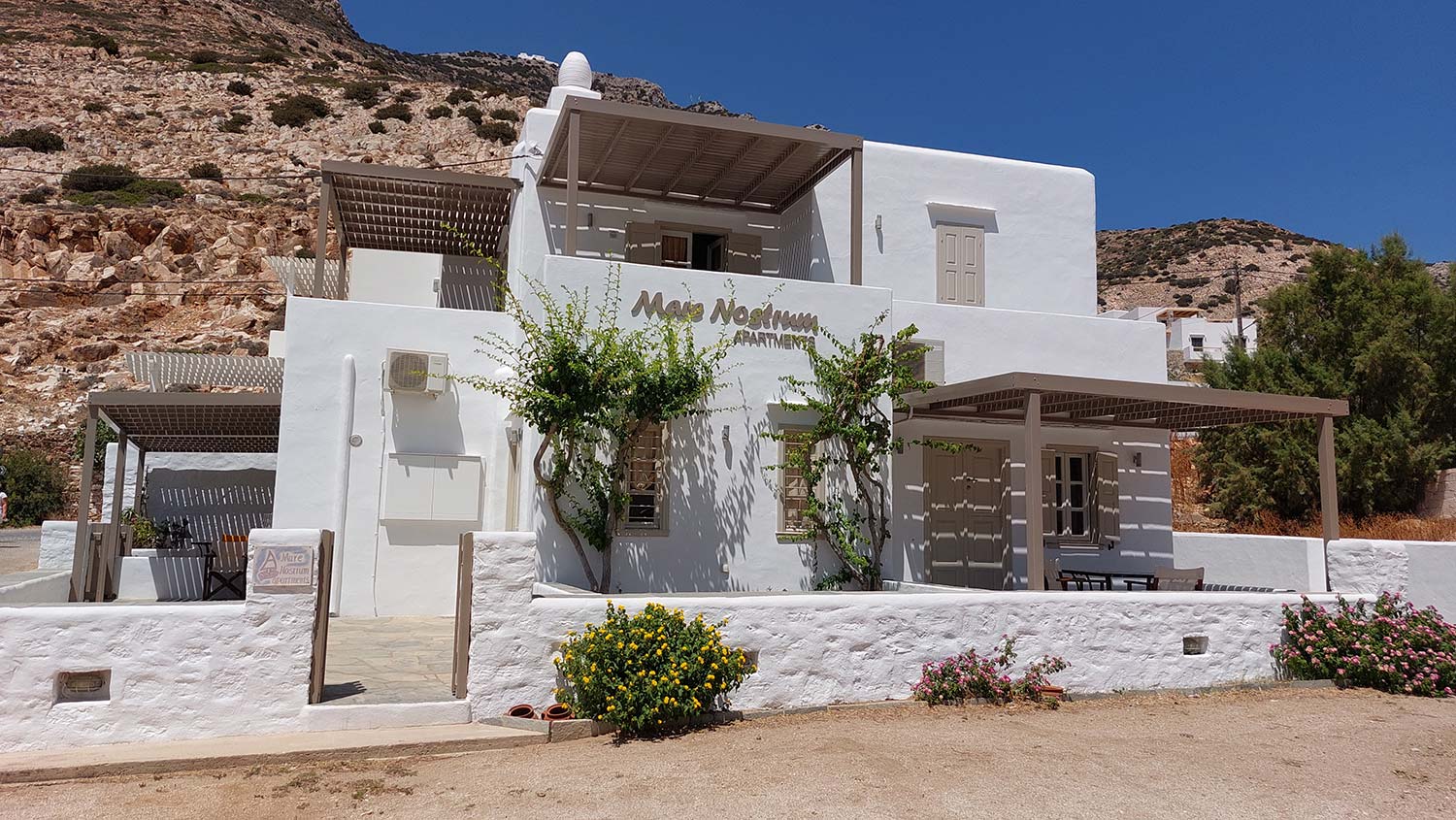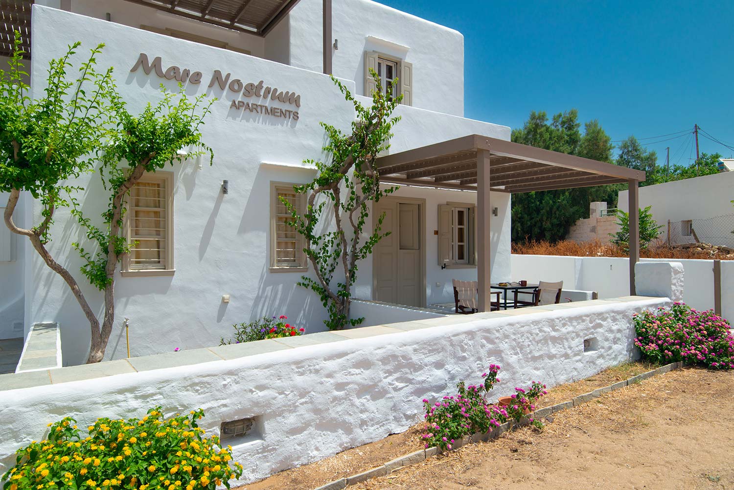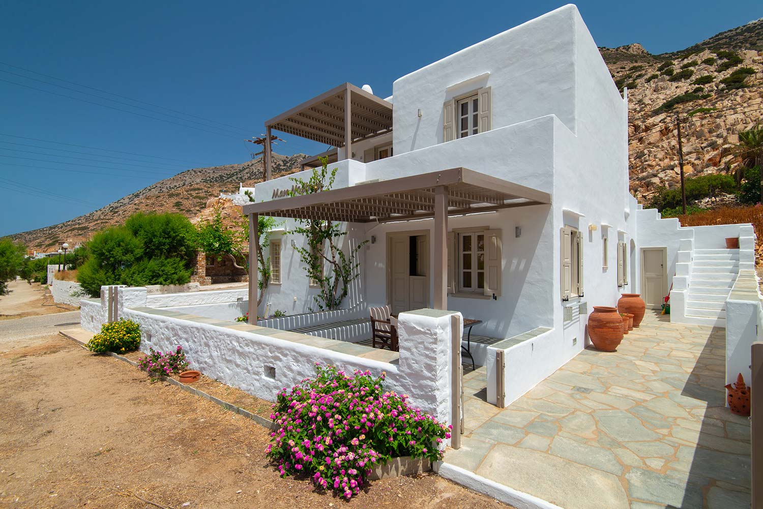 Πέντε διαμερίσματα με λιτή αλλά κομψή διακόσμηση, που ακολουθούν την παραδοσιακή κυκλαδίτικη αισθητική με μοντέρνες πινελιές.