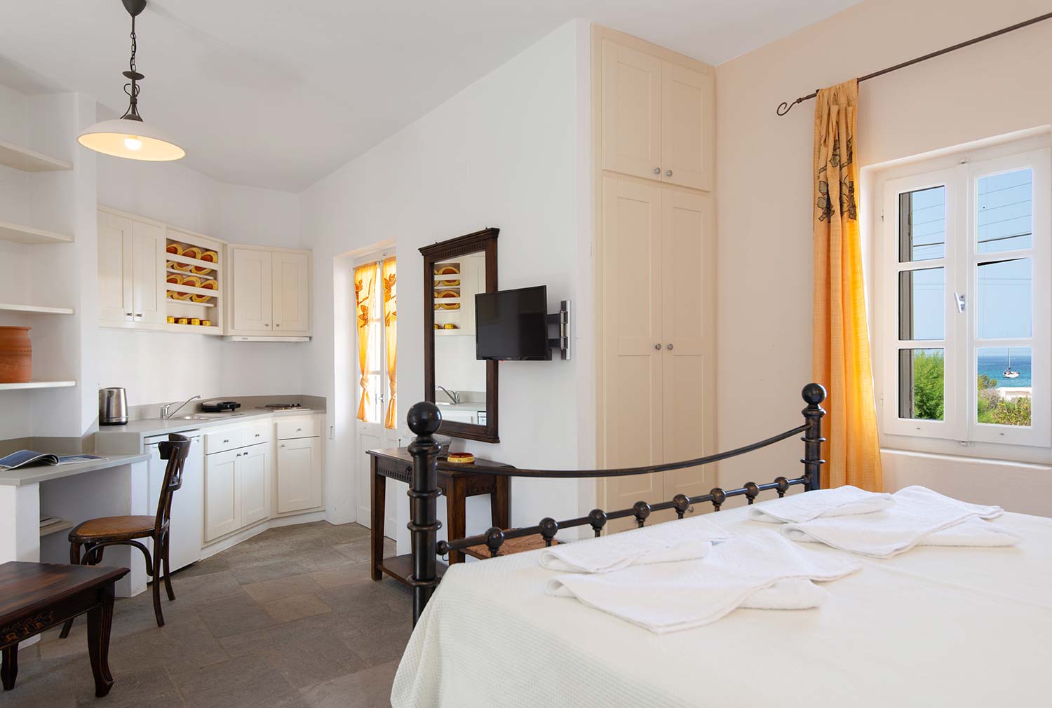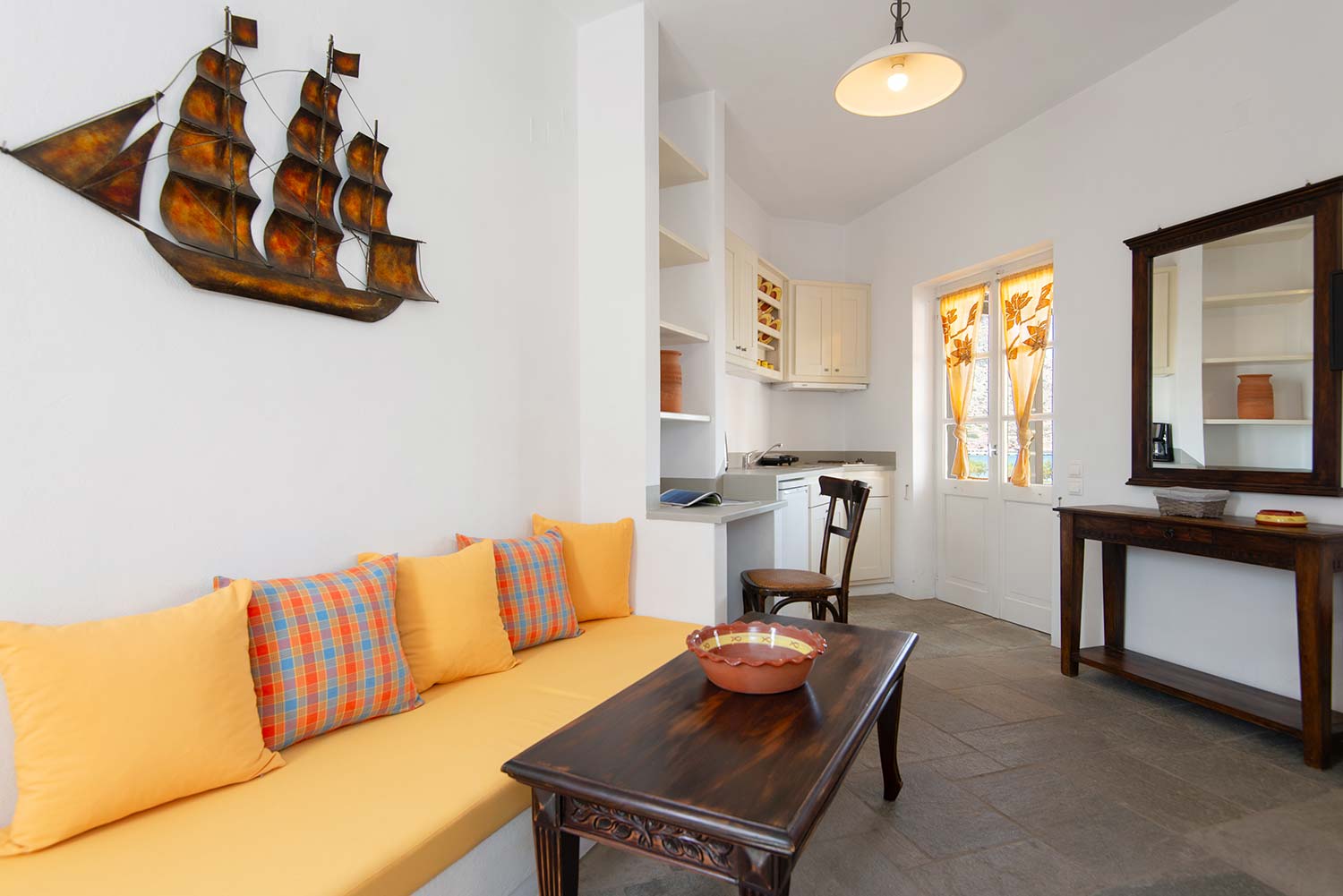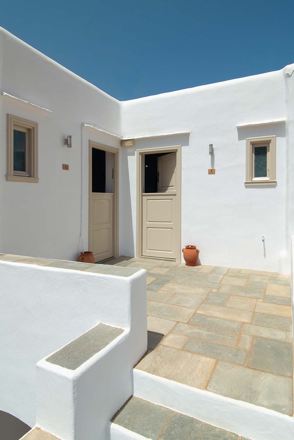 Το Διαμέρισμα 2, βρίσκεται επίσης στον πρώτο όροφο και διαθέτει μαγευτική θέα προς τη θάλασσα, προσφέροντας μια απόλυτα χαλαρωτική διαμονή. Το διαμέρισμα είναι πλήρως εξοπλισμένο με κουζίνα που διαθέτει όλα τα απαραίτητα για την προετοιμασία γευμάτων, καθώς και ένα ευρύχωρο καθιστικό με παραδοσιακή διακόσμηση και φωτεινά χρώματα που προσδίδουν ζεστασιά στον χώρο. Το άνετο υπνοδωμάτιο με το σιδερένιο κρεβάτι προσφέρει την τέλεια αίσθηση ηρεμίας και άνεσης. Το μπάνιο είναι μοντέρνο και άνετο, με λιτή διακόσμηση που δένει αρμονικά με την κυκλαδίτικη αισθητική. Στο μπαλκόνι, οι επισκέπτες μπορούν να απολαύσουν την ανεμπόδιστη θέα στο γαλάζιο του Αιγαίου.