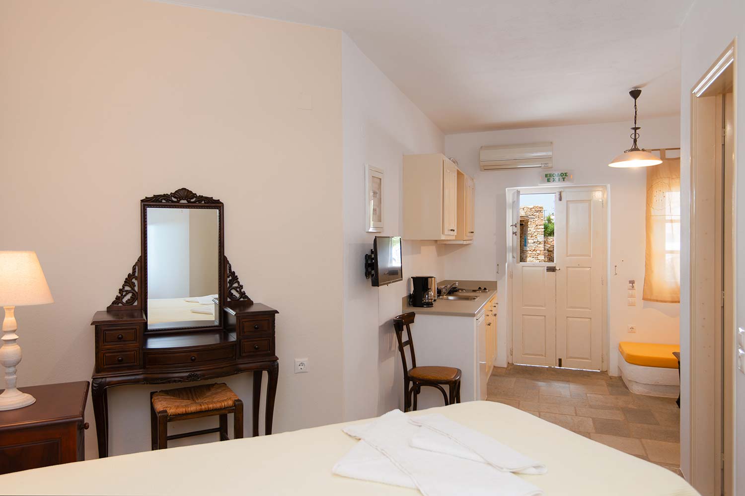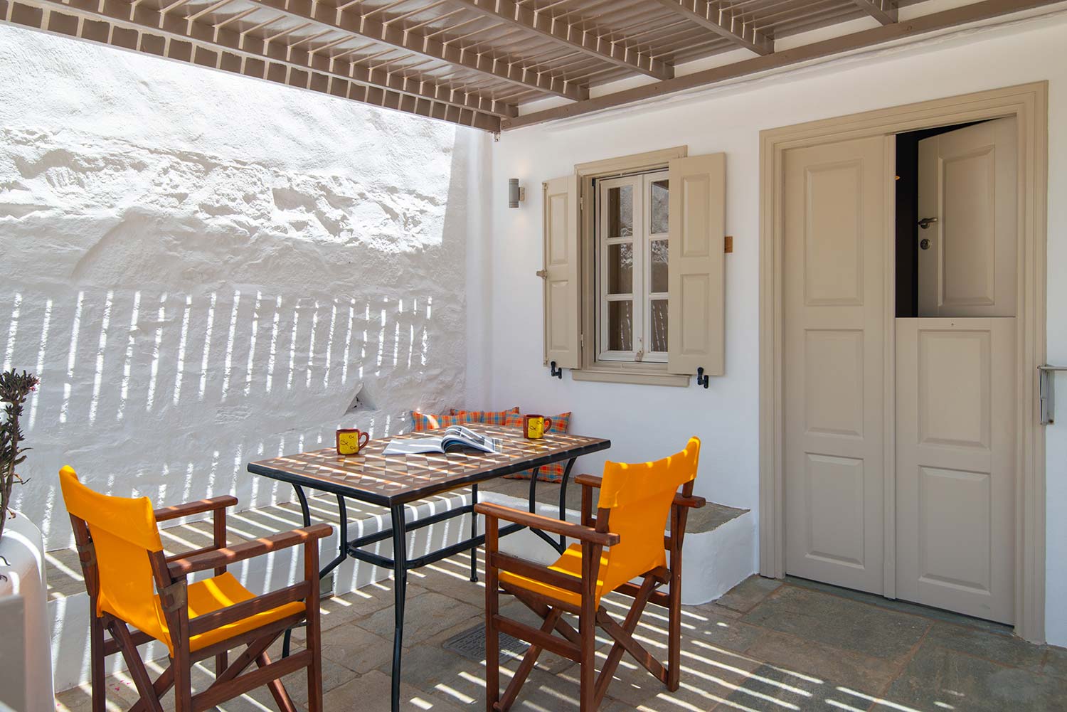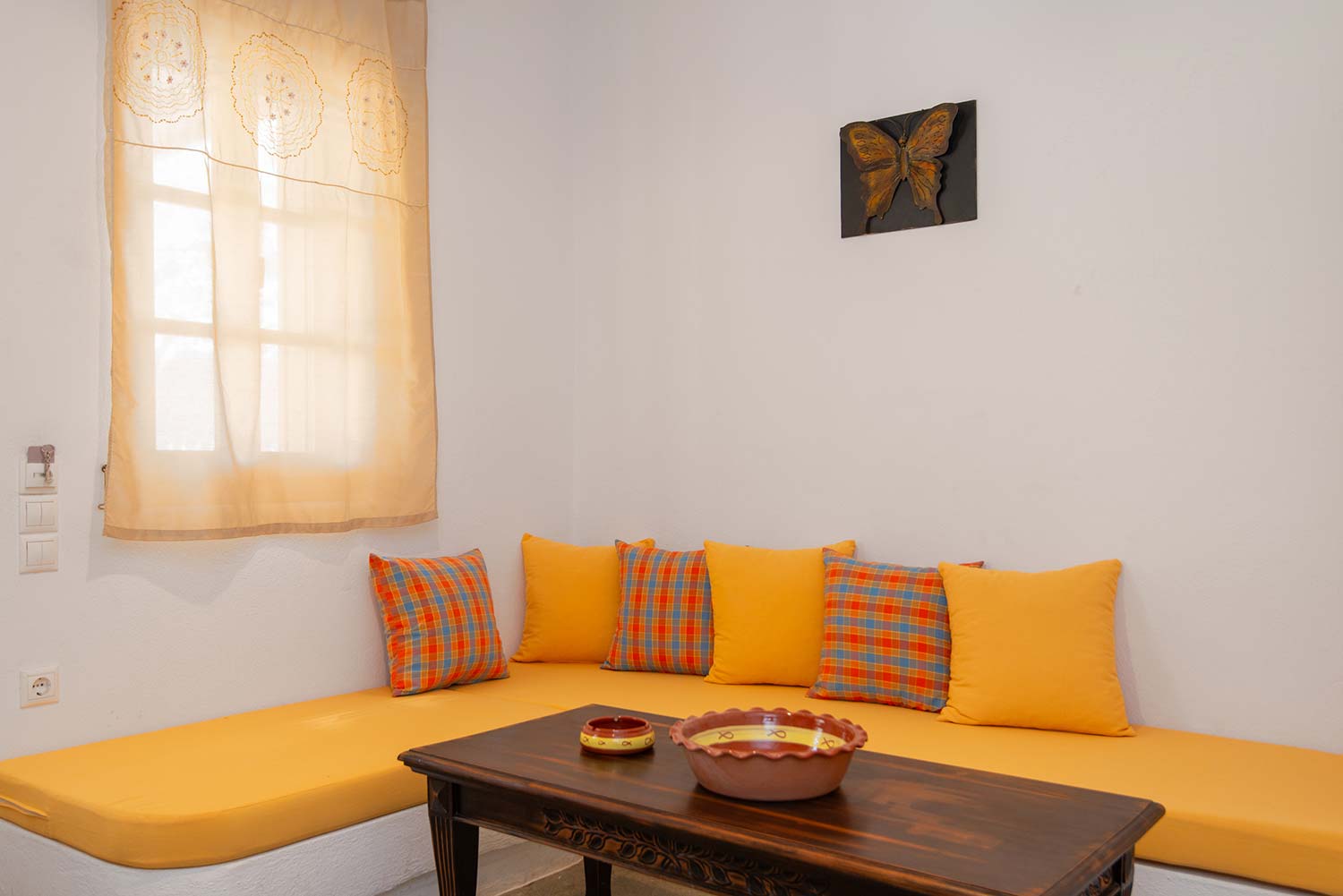 Το διαμέρισμα 4, επίσης στο ισόγειο, προσφέρει έναν γαλήνιο χώρο με παραδοσιακή διακόσμηση και όλες τις σύγχρονες ανέσεις. Με άμεση πρόσβαση σε έναν όμορφα διαμορφωμένο εξωτερικό χώρο, ιδανικό για στιγμές χαλάρωσης κάτω από την πέργκολα. Το κουζινάκι είναι πλήρως εξοπλισμένο, ενώ το υπνοδωμάτιο διαθέτει ένα άνετο κρεβάτι και καλαίσθητη διακόσμηση. Το καθιστικό, με τα έντονα χρώματα και τις ζεστές πινελιές, προσκαλεί τον επισκέπτη να απολαύσει ήσυχες στιγμές ξεκούρασης.