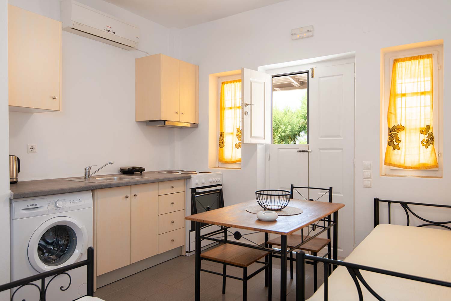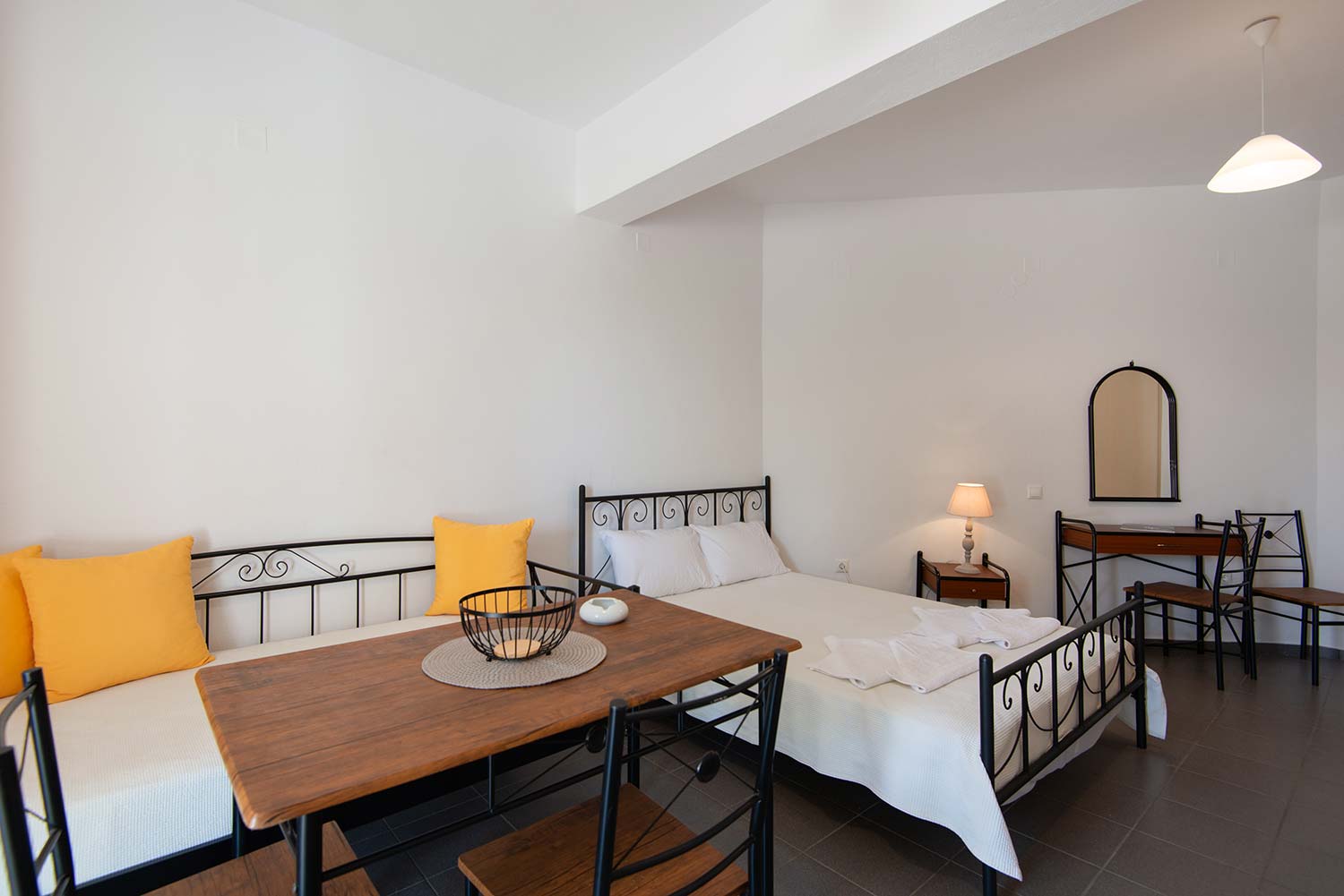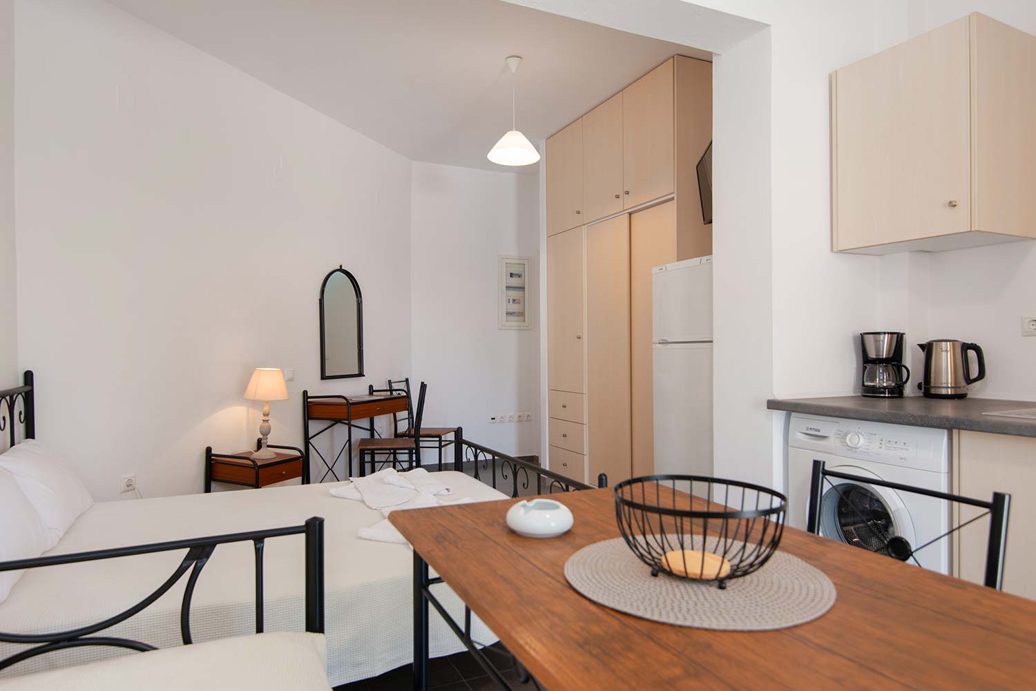 Ευρύχωρο διαμέρισμα διακοσμημένο στο ίδιο μοτίβο, που προσφέρεται για μικρές οικογένειες καθώς διαθέτει μεγάλο ψυγείο και κουζίνα-φούρνο. Ο ενιαίος χώρος περιλαμβάνει κουζίνα, καθιστικό με μεγάλο καναπέ και τραπέζι φαγητού καθώς και το υπνοδωμάτιο, όλα σχεδιασμένα με έμφαση στην άνεση και την κομψότητα. Η βεράντα προσφέρεται για ώρες χαλάρωσης καθώς και για να απολαμβάνετε τα χρυσαφένια χρώματα της δύσης του ήλιου.